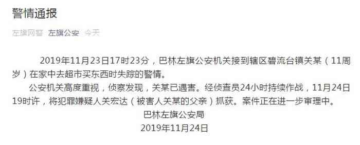 中新网2019年11月25日电 据内蒙古赤峰市巴林左旗公安局官方微信消息,2019年11月23日17时23分,巴林左旗公安机关接到辖区碧流台镇关某(11周岁)在家中去超市买东西时失踪的警情。公安机关侦察发现,关某已遇害。