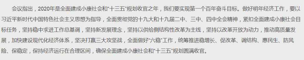 上述表述有几点需要注意。其一,紧扣全面建成小康社会目标任务。确保全面建成小康社会和“十三五”规划圆满收官。其二,对三大攻坚战的说法由“继续打好”变为了“坚决打赢”,表述背后的含义各位不妨自己琢磨一下。其三,全面做好“六稳”工作,统筹推进稳增长、促改革、调结构、惠民生、防风险、保稳定。补一句,去年也提到了“统筹推进稳增长、促改革、调结构、惠民生、防风险工作”,“保稳定”是新增说法。会议还提到,当前和今后一个时期,我国经济稳中向好、长期向好的基本趋势没有变。
