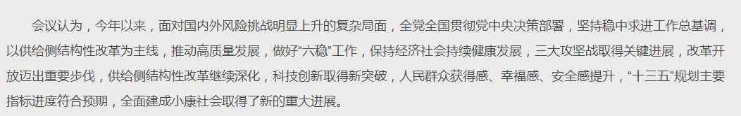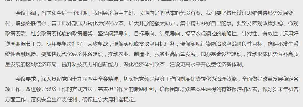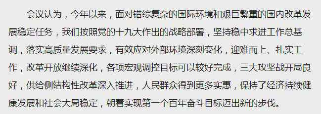 几个点提一下。其一,再提“集中精力办好自己的事”。虽然“国内外风险挑战明显上升”,但我们要坚持用辩证思维看待形势发展变化,增强必胜信心,善于把外部压力转化为深化改革、扩大开放的强大动力,集中精力办好自己的事。其二,运用好逆周期调节工具。要坚持宏观政策要稳、微观政策要活、社会政策要托底的政策框架,坚持问题导向、目标导向、结果导向,提高宏观调控的前瞻性、针对性、有效性,运用好逆周期调节工具。其三,三大攻坚战要“坚决打好”,脱贫攻坚目标任务、污染防治攻坚战阶段性目标要“确保实现”,确保不发生系统性金融风险。另外,区域经济布局也值得关注。在去年的政治局会议上就提到,“促进区域协调发展”,今年提出的要求是推动形成优势互补高质量发展的区域经济布局。另外,在12月4日的党外人士座谈会上,高层也听取了推进长三角一体化战略、促进粤港澳大湾区发展等方面的意见和建议。
