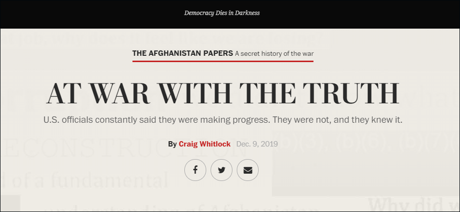 “在长达18年的阿富汗战争中,美国高级官员们对美军和美国民众隐瞒了战争真相。”
