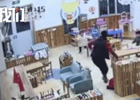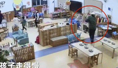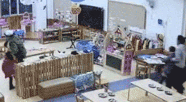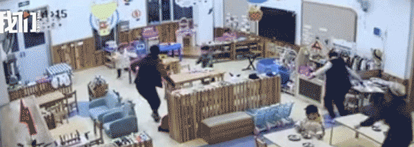 另外一名老师急忙拎起一个学生,又将旁边蹲着的小朋友拽起来一起跑出去;