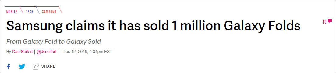 据科技媒体“The Verge”12月12日报道,三星电子总裁孙英权(Young Sohn)周四在柏林举行的一场活动中透露,Galaxy Fold的销量已经达到100万部。