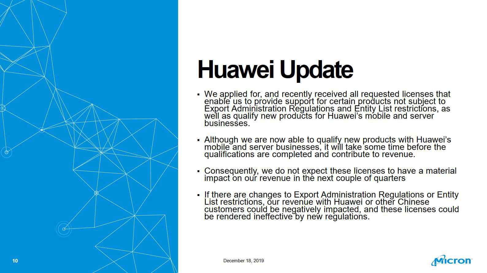当地时间18日,美光发布声明表示,已经获得了向其最大客户华为供应某些产品所需的全部许可证。该公司同时称,预计其财务表现在2020财年第二季度"周期性触底"后,将于明年复苏。