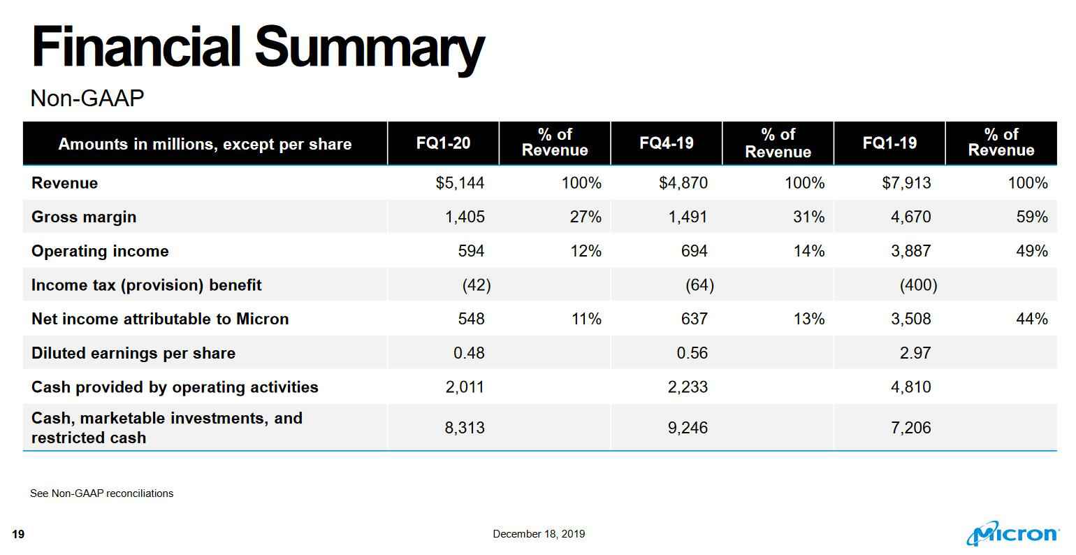 财报显示,在截至11月28日的2020财年第一季度,美光营收为51.44亿美元,与去年同期的79.13亿美元相比大跌35%;净利润为4.91亿美元,与去年同期的32.93亿美元相比暴降85%。